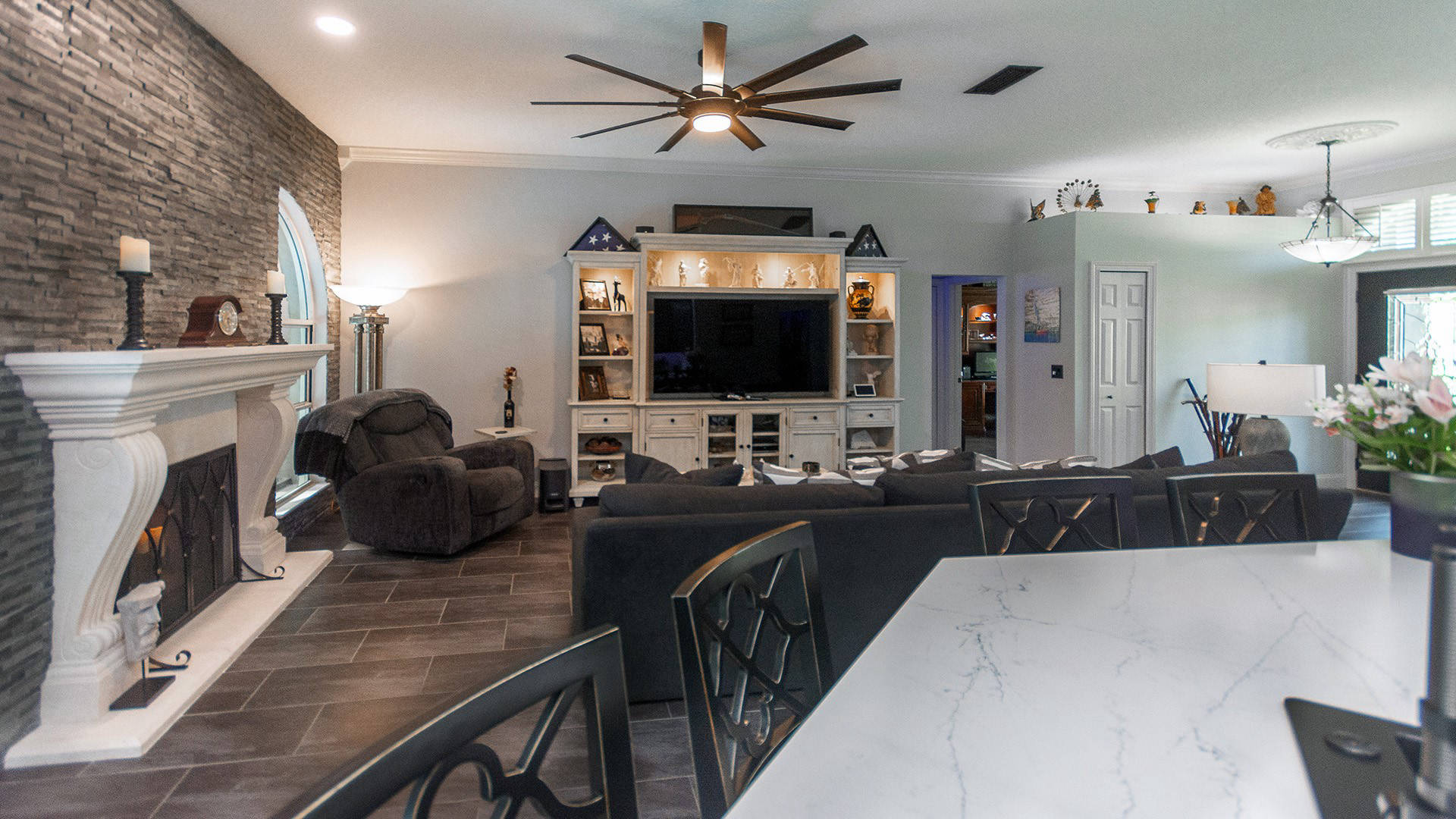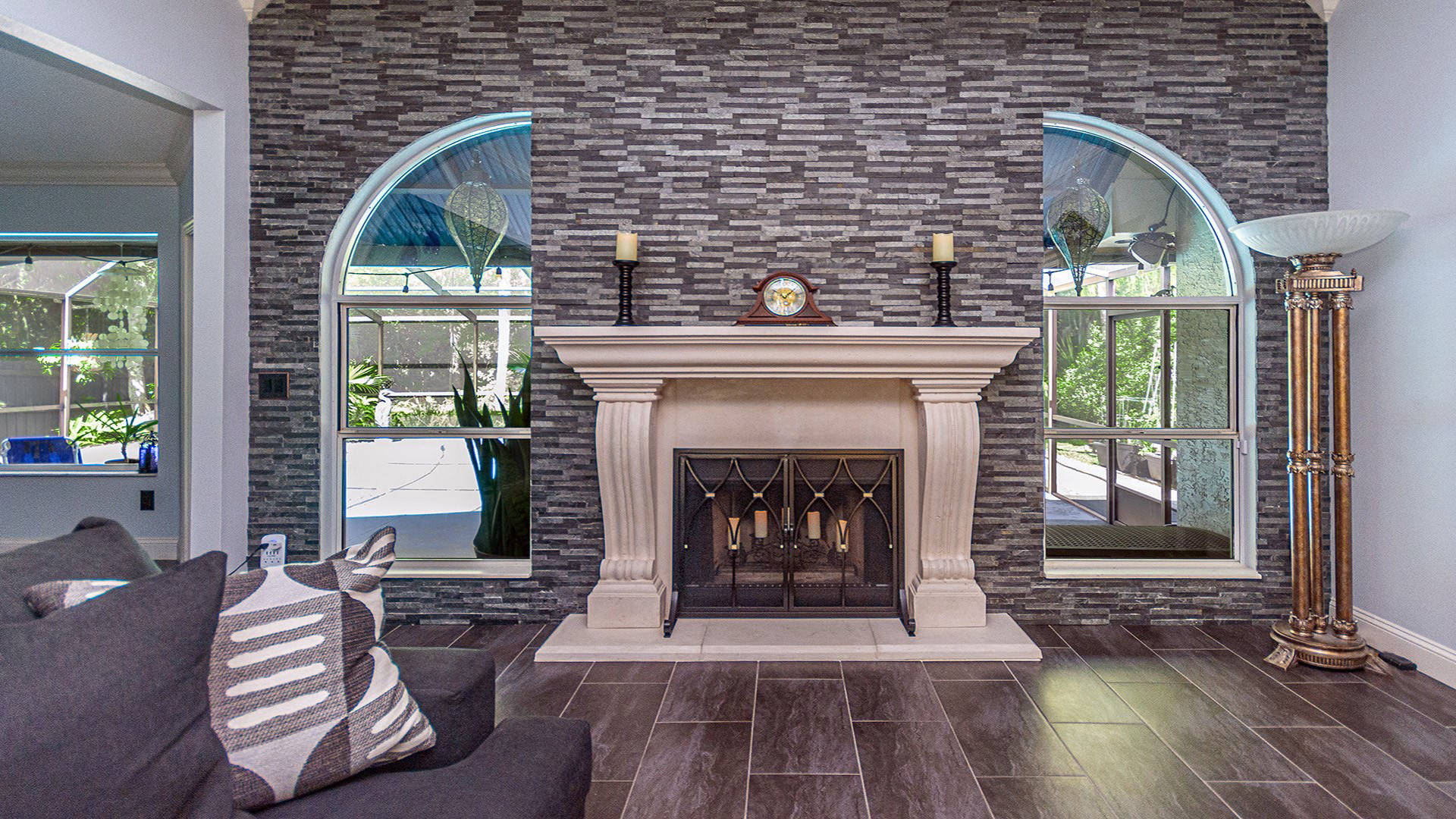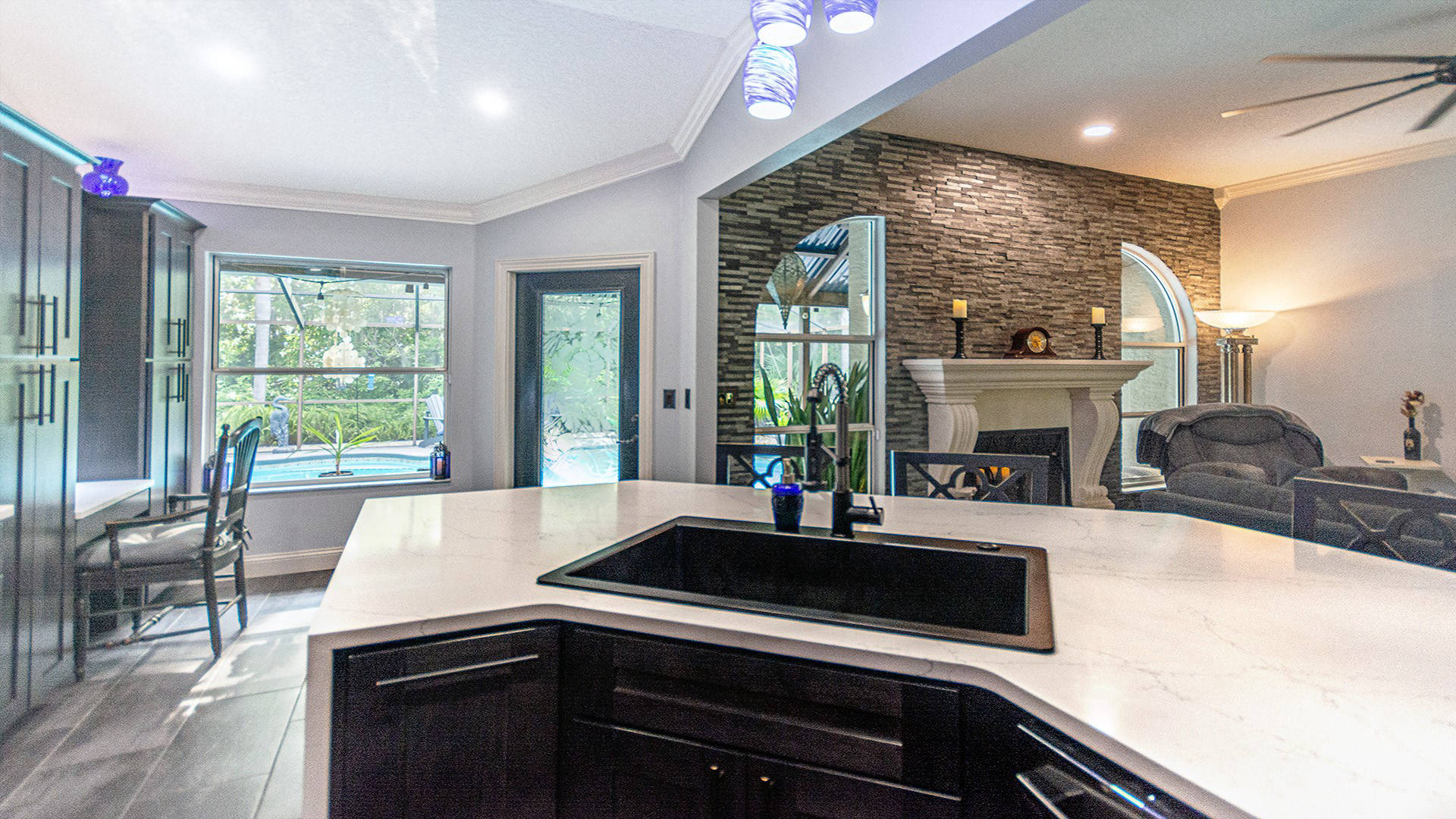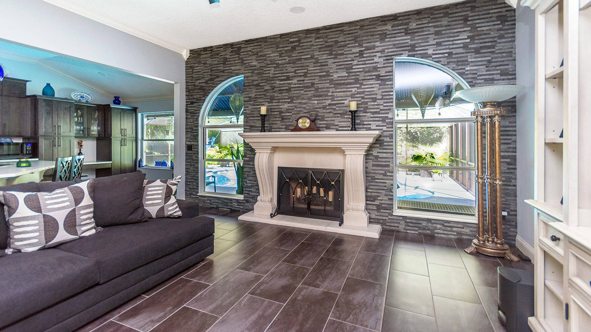 Outstanding Design! Impeccable Decor! Stunning pool home in the gated community of The Woods offers the perfect blend of modern luxury & everyday comfort. Meticulously maintained & remodeled, featuring such high-end finishes as quartz countertops, backsplash & waterfall edge, premium porcelain tile, European stone fireplace, custom cabinetry & built-ins, stack stone fireplace wall, knockdown ceilings, textured walls, recessed lighting, crown moldings & 5'' baseboards.