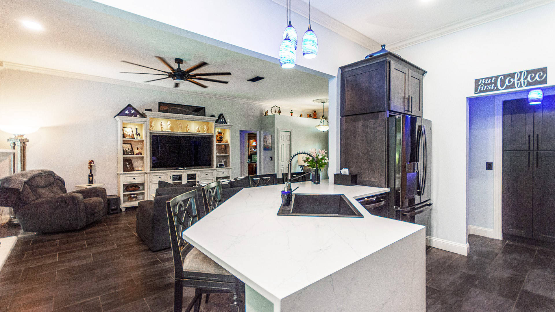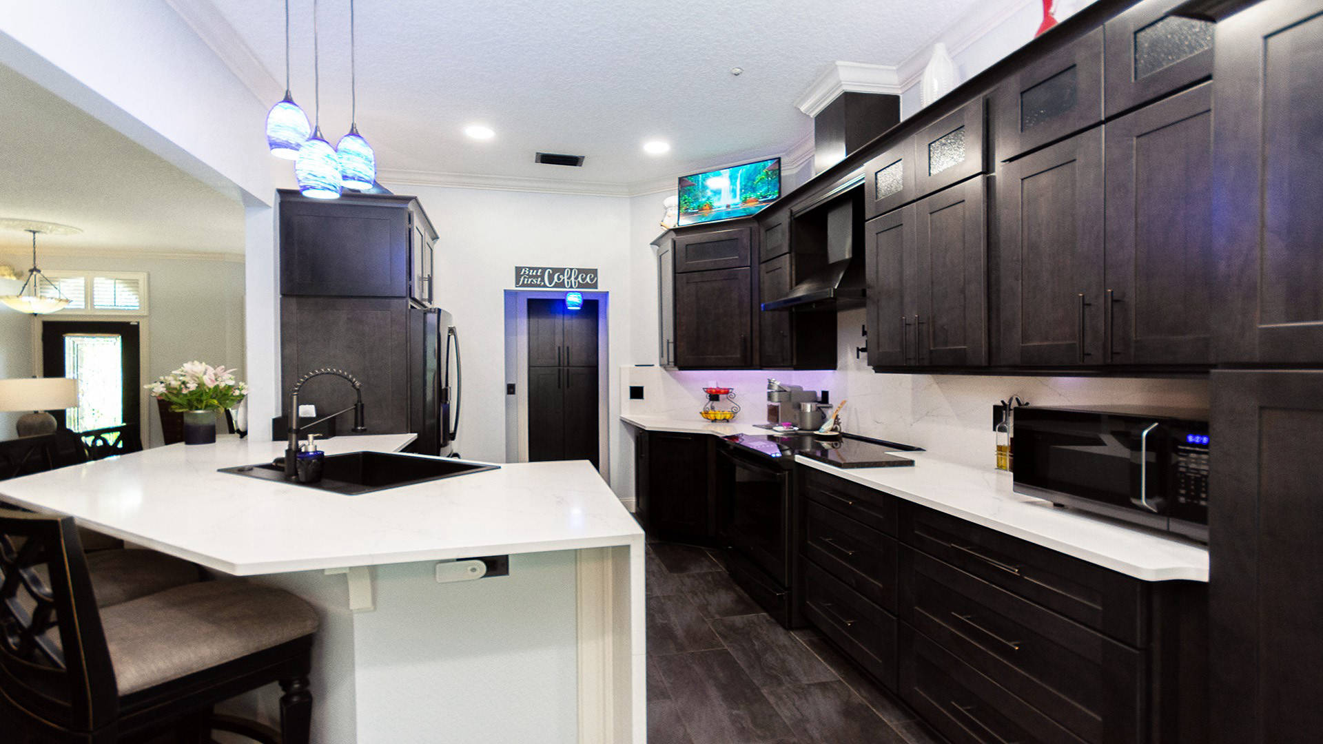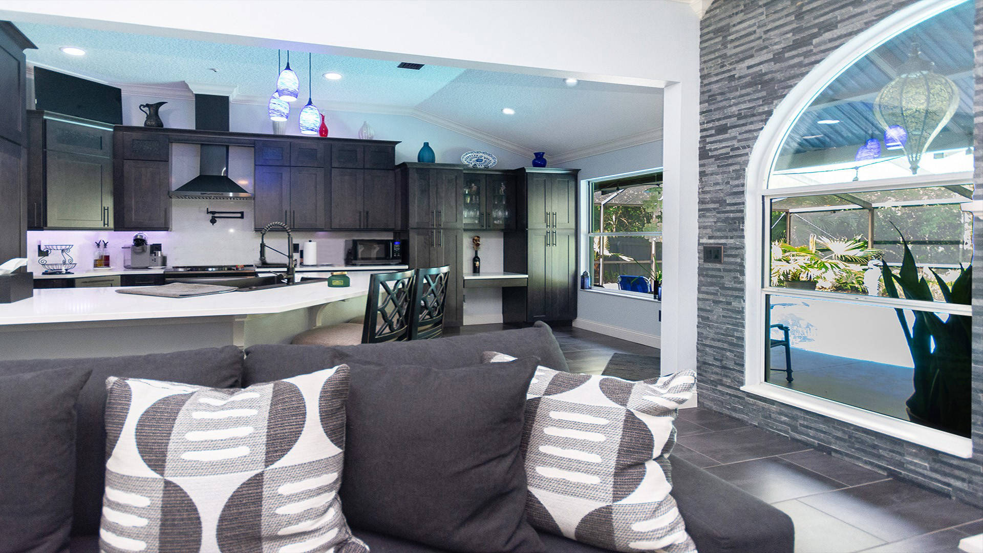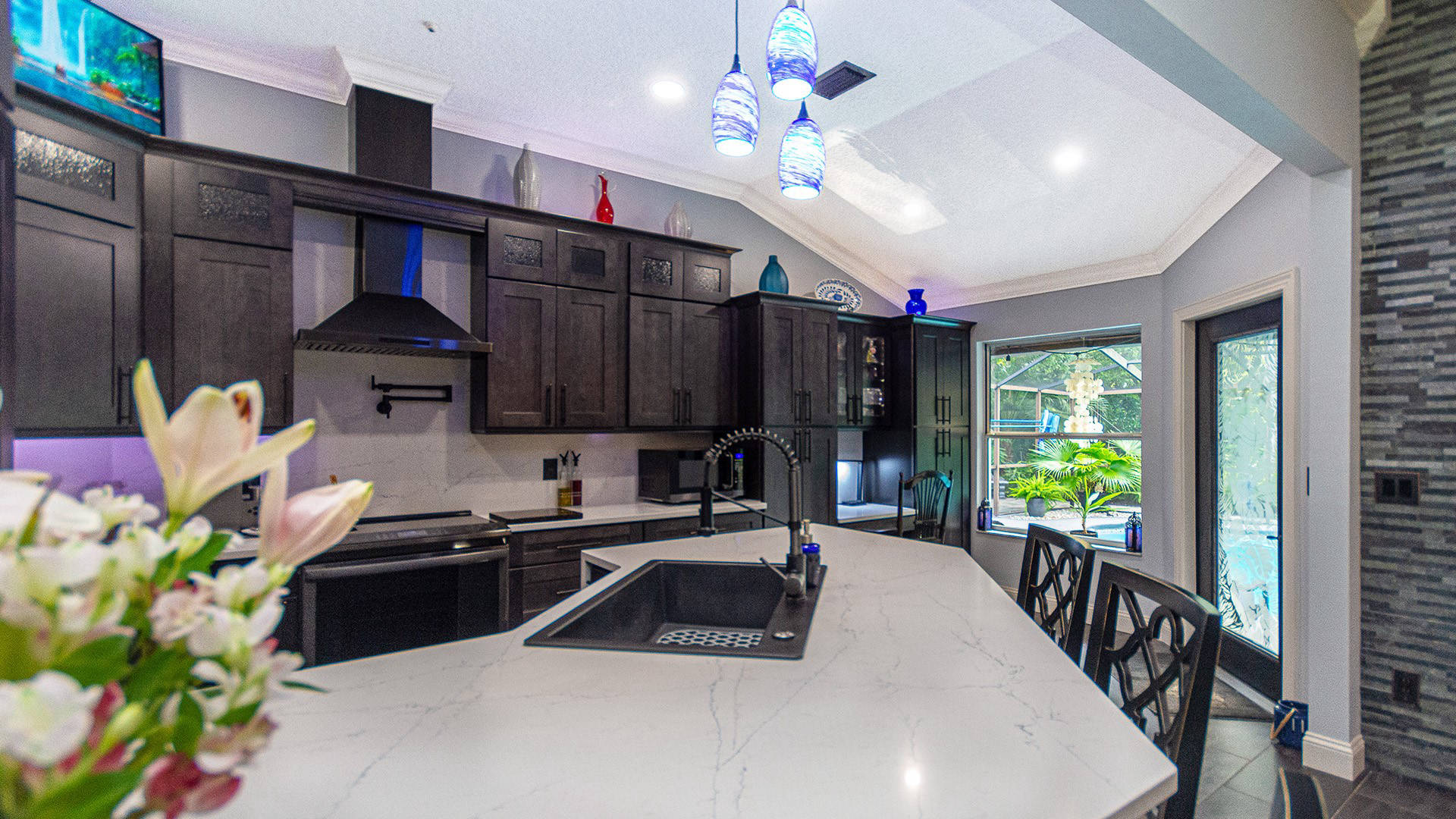 Outstanding Design! Impeccable Decor! Stunning pool home in the gated community of The Woods offers the perfect blend of modern luxury & everyday comfort. Meticulously maintained & remodeled, featuring such high-end finishes as quartz countertops, backsplash & waterfall edge, premium porcelain tile, European stone fireplace, custom cabinetry & built-ins, stack stone fireplace wall, knockdown ceilings, textured walls, recessed lighting, crown moldings & 5'' baseboards.